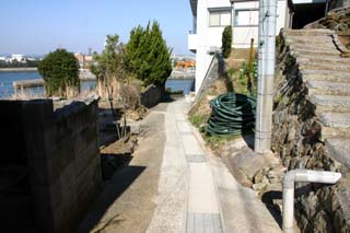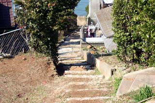 ![]() しばらくすると、コンクリート舗装の階段 ⇒ 坂道になります。 この坂道を下りたら、写真奥ではなく手前の方に進みましょう。 |
