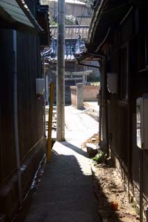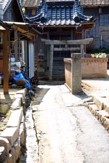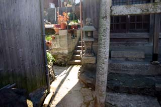 ![]() いまいち目印になるものがないのですが…写真左手に見えるハシゴが、なんとか目印になると思います(^^; このハシゴの前から、写真右手方向へ進みます。 | ![]() 細い路地を進んで行きます。 奥の方に、鳥居と神社が見えます。 |