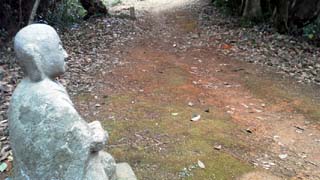![]() 階段を上りきってしばらく進むと、左手にお地蔵様(?)が見えてきます。 一本道のように見えますが、ここが分岐点です。 |