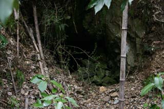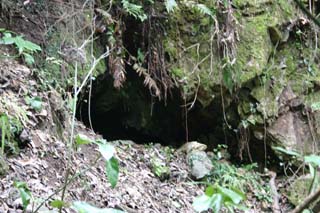 ![]() 炉の跡の右側に目を向けると、道脇の斜面に、坑道への入口跡がぽっかりと口を開けています。 間違っても、「入ろう」なんて思わないで下さいね!^^; |