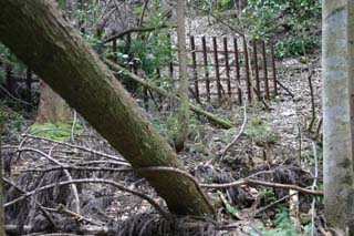 ![]() 上記の坑道入口跡の先に少し進むと、写真の鉄柵がすぐ見つかると思います。 この鉄柵を越えて行きます。鉄柵の右手の隙間を越えていくかたちになります。 (鉄柵を左手側にして進むかたちになりますね。 鉄柵を右手側にして進むかたちになると、逆方向に進んでいますので、反対側に進みましょう) |